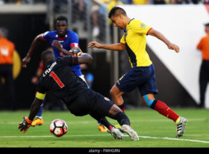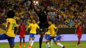 Johny Placide dans les airs face aux attaquants brésiliens lors de la Copa America Centenario/ Crédit Photo : CONMEBOL
