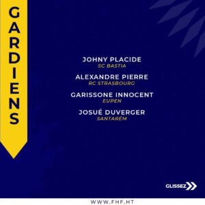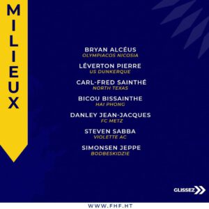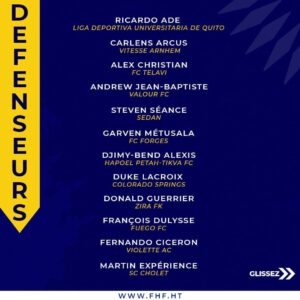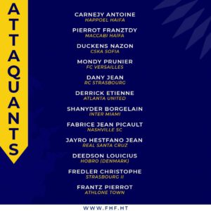 Pour sa grande première, le jeune technicien a fait appel à quatre (4) nouvelles têtes en renfort aux anciens joueurs cadres.Ces nouveaux sélectionnés sont les défenseurs : Duke Lacroix (Colorado Springs), Fernando Cicéron (Violette AC) et les attaquants : Jayro Hestefano Jean ( Real Santa Cruz) et Frantz Pierrot ( Athlone Town).