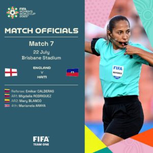 La FIFA a révélé les identités des quatre (4) abitres qui officieront lors du match entre les sélections anglaise et haïtienne dans le Groupe B de la 9ème édition de la Coupe du Monde féminine 2023. Le corps abitral eet composé de deux (2) vénézuéliennes, d’une colombienne et une costa ricaine.