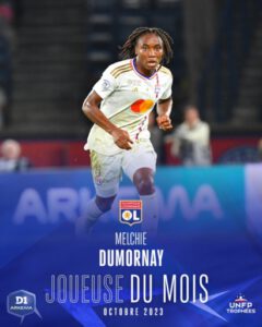Le trophée récompensant la « Meilleure Joueuse » du mois d’Octobre 2023, dans le championnat féminin français de Première Division est remporté par l’Haïtienne Melchie Daëlle Dumornay. La nouvelle recrue de l’Olympique Lyonnais devance les Françaises Grace Geyoyo et Louise Fleury, respectivement joueuses du Paris Saint-Germain et du Paris FC.