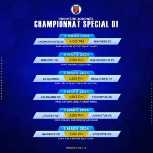 La Fédération Haïtienne de Football FHF est contrainte de reporter la Première journée du Championnat Spécial de D1 dont le match inaugural entre les Cosmopolites SC de Delmas et le Tempête FC de Saint-Marc était prévu ce samedi 2 Mars 2024 au Parc Level.
