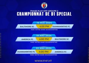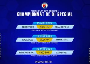 Selon un communiqué de la FHF, les play-offs débuteront le 15 Mai 2024 aux Parcs Saint Victor du Cap-Haïtien (Nord) et Notre Dame de Ouanaminthe (Nord’Est) choisis comme deux principaux sièges.