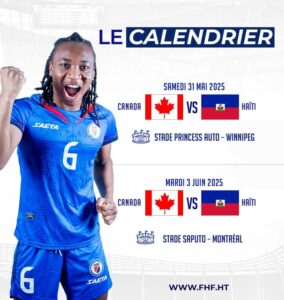 Les sélections nationales féminines haïtienne et canadienne de football s’affronteront en amical, les 31 mai et 3 juin 2025, dans le cadre d’une double confrontation. Les deux rencontres se joueront au Canada, selon les confirmations de la Fédération Haïtienne de Football (FHF).