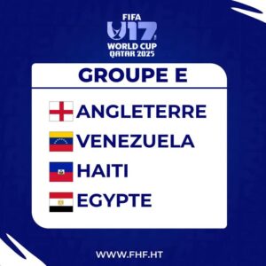 À l’issue du tirage au sort du de la coupe du monde U-17 Qatar 2025, déroulé le dimanche 25 mai, Haïti a hérité de l’Angleterre, du Venezuela et de l’Égypte dans le Groupe E. Haïti va honorer sa 3e participation à une phase finale de coupe du monde dans cette catégorie après 2007 et 2019.