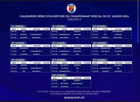 CHFP-HAÏTI CHFP-HAÏTI Championnat Spécial de D1 : Le Calendrier de la série d’ouverture a fuité !By Frandy Présendieu28 février 2024 La reprise du football en Haïti arrivera dans moins de cinq (5) jours. Et tous les 15 clubs engagés dans…